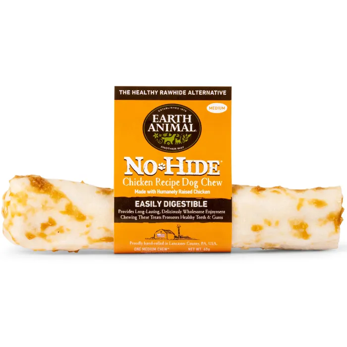 Earth Animal heeft met de No-Hide een kauwkluif ontwikkelt die wel de voordelen van een Rawhide heeft, maar niet de nadelen. Rawhide is gemaakt van runderhuid die met chemicaliën zacht en wit wordt gemaakt om de rawhide mee te maken. De bewerkte stukken runderhuid vallen vaak zwaar op de maag en zijn moeilijk verteerbaar. Door de Earth Animal No-Hide te maken van hele andere ingrediënten, is de No-Hide goed verteerbaar en niet behandeld met chemicaliën. De hond is wel lang bezig met kluiven.
