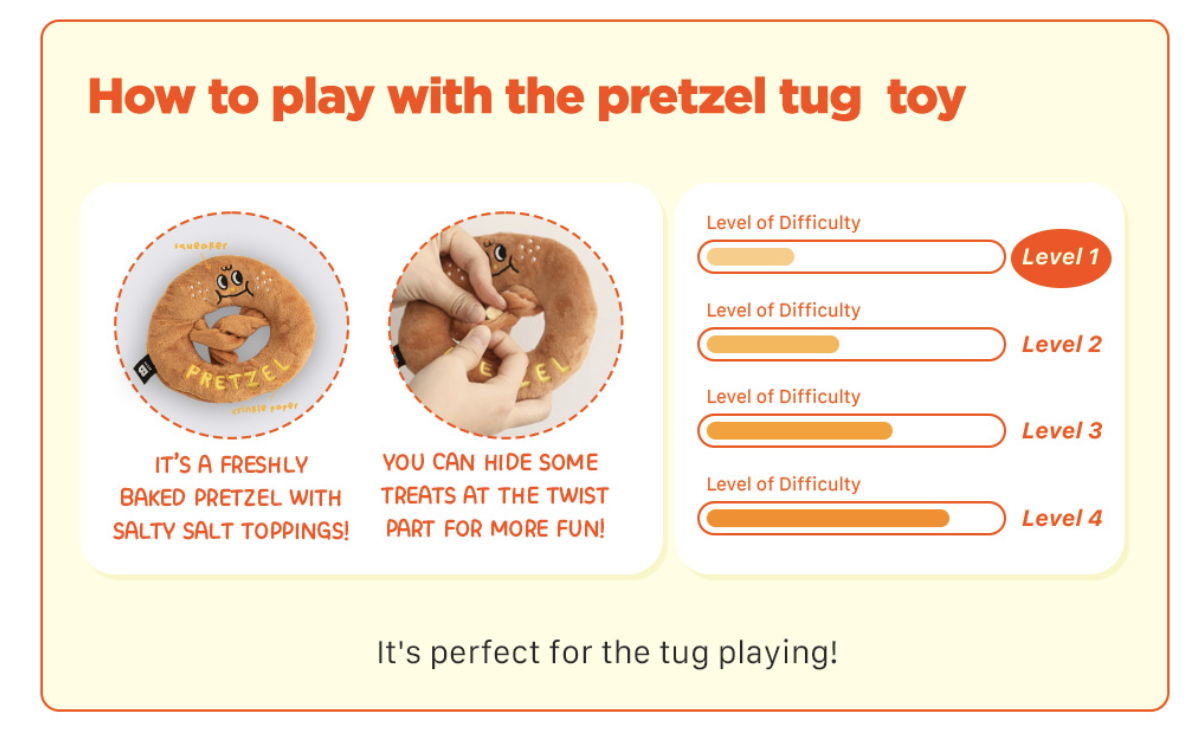 De perfecte versgebakken pretzel met een zoute bovenkant!– Speel een trekspelletje met je pup!– Verstop wat lekkers in het dichtgeknoopte midden