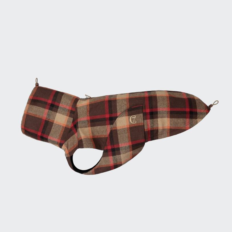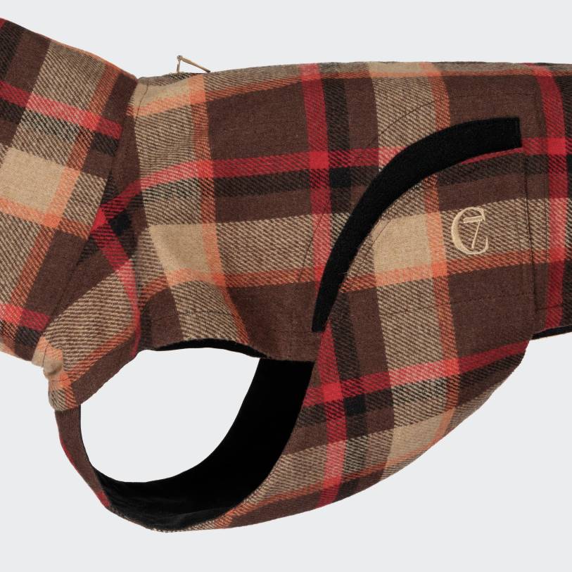 Herfst hondenjas en hondenregenjas in oranje, bruin en beige geruit met een comfortabele pasvorm, afgewerkt met een zeer waterafstotende wolmix.